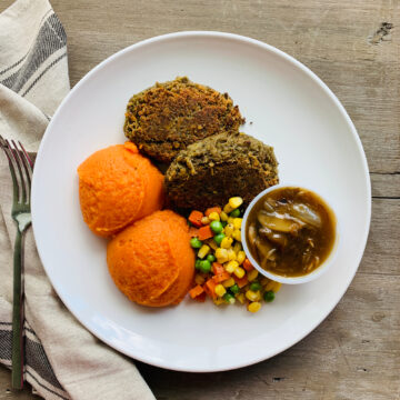 Vegan/VegetarianVegan salisbury steak served with peas and carrots